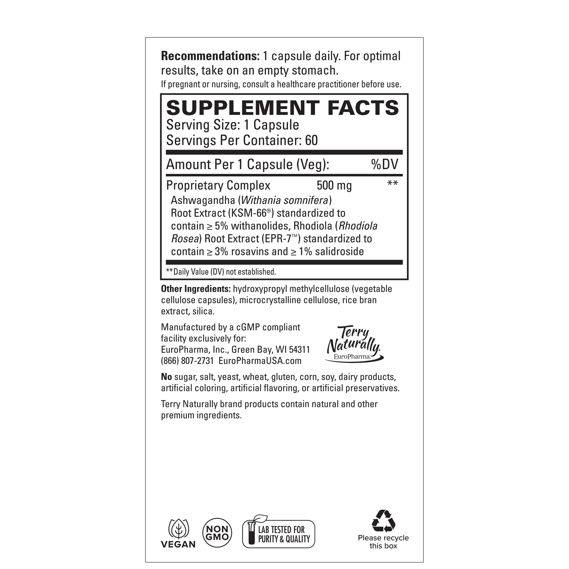 Ashwagandha (Withania somnifera) Root Extract (KSM-66®) standardized to contain ≥ 5% withanolides, Rhodiola (Rhodiola Rosea) Root Extract (EPR-7™) standardized to contain ≥ 3% rosavins and ≥ 1% salidroside **Daily Value (DV) not established. |