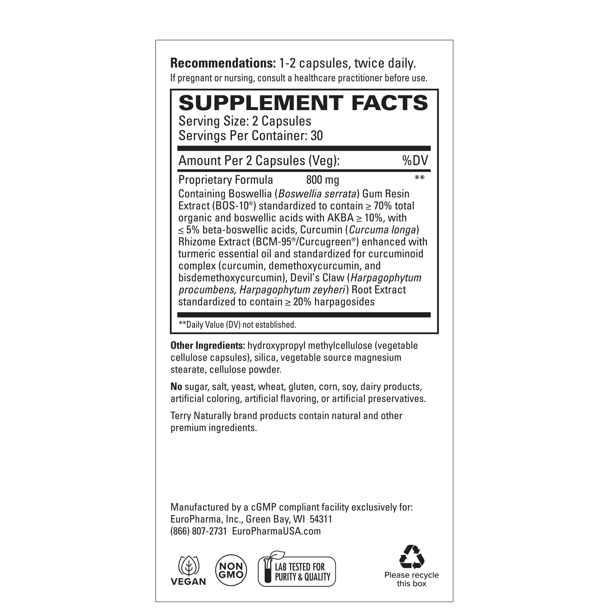 Containing Boswellia (Boswellia serrata) Gum Resin Extract (BOS-10®) standardized to contain ≥ 70% total organic and boswellic acids with AKBA ≥ 10%, with ≤ 5% beta-boswellic acids, Curcumin (Curcuma longa) Rhizome Extract (BCM-95®/Curcugreen®) enhanced with turmeric essential oil and standardized for curcuminoid complex (curcumin, demethoxycurcumin and bisdemethoxycurcumin), Devil’s Claw (Harpagophytum procumbens, Harpagophytum zeyheri) Root Extract standardized to contain ≥ 20% harpagosides **Daily Value (DV) not established. |
