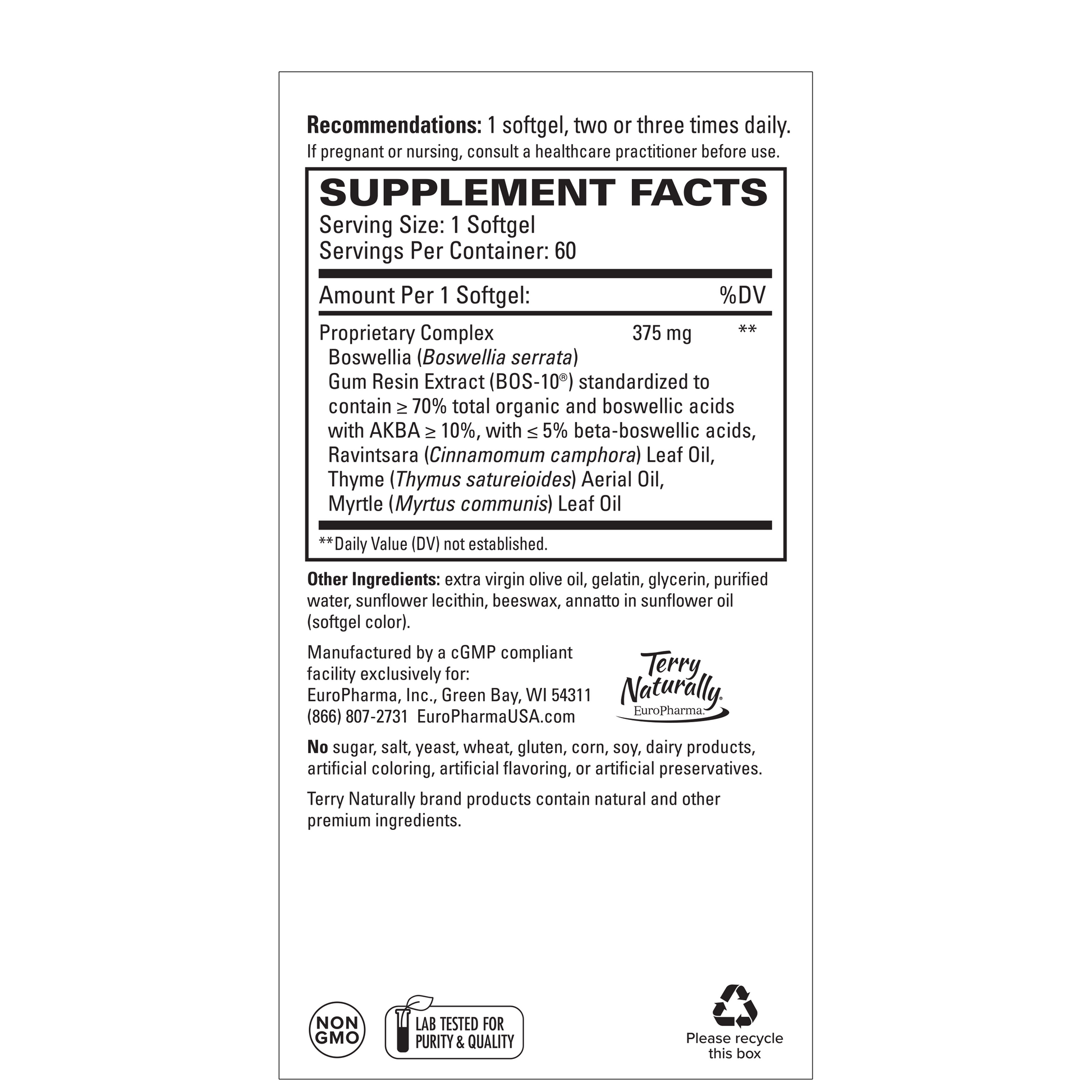 Boswellia (Boswellia serrata) Gum Resin Extract (BOS-10®) standardized to contain ≥ 70% total organic and boswellic acids with AKBA ≥ 10%, with ≤ 5% beta-boswellic acids, Ravintsara (Cinnamomum camphora) Leaf Oil, Thyme (Thymus satureioides) Aerial Oil, Myrtle (Myrtus communis) Leaf Oil ** Daily Value (DV) not established. |