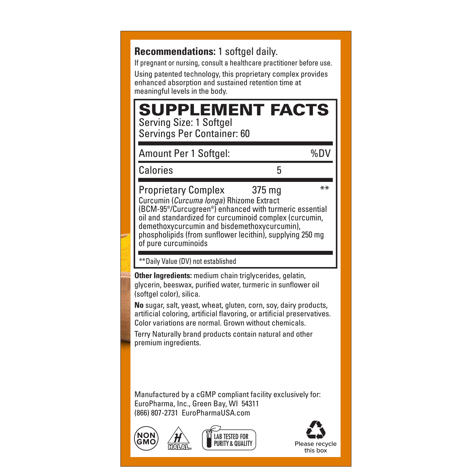 Curcumin (Curcuma longa) Rhizome Extract (BCM-95®/Curcugreen®) enhanced with turmeric essential oil and standardized for curcuminoid complex (curcumin, demethoxycurcumin and bisdemethoxycurcumin), phospholipids (from sunflower lecithin), supplying 250 mg of curcuminoids **Daily Value (DV) not established. |