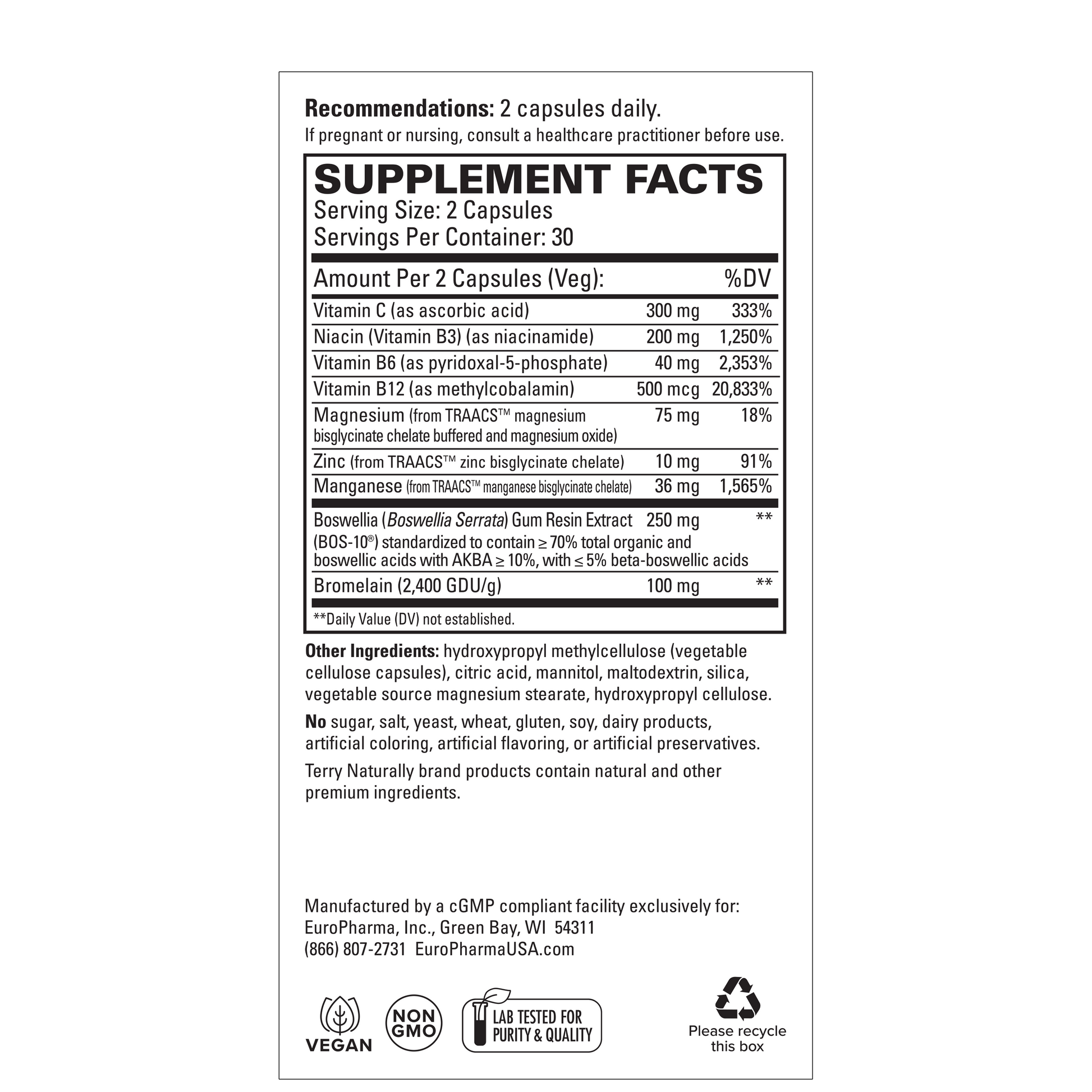 | Boswellia (Boswellia Serrata) Gum Resin Extract (BOS-10®) standardized to contain ≥ 70% total organic and boswellic acids with AKBA ≥ 10%, with ≤ 5% beta-boswellic acids |