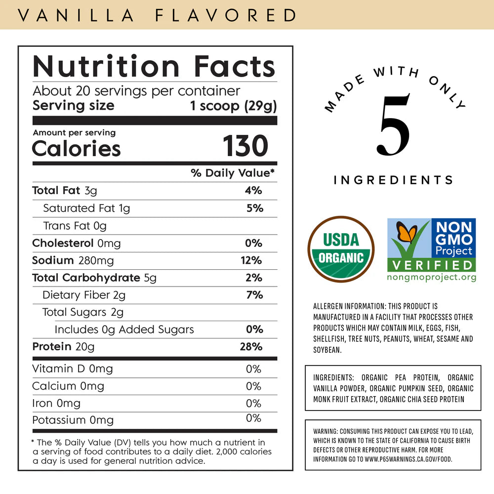 Our USDA Organic Vanilla Plant Based Protein Powder is made with only 5 ingredients. Its non-gritty texture and monk fruit sweetened vanilla make it taste like a ice cream sundae.