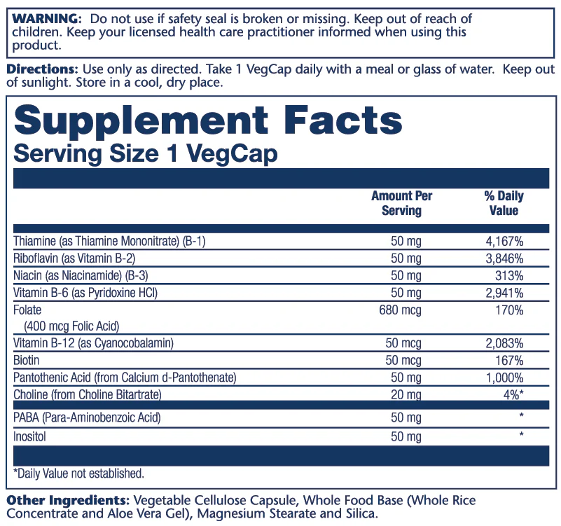 Thiamine (as Thiamine Mononitrate) (B-1), Riboflavin (Vitamin B-2), Niacin (as Niacinamide) (B-3), Vitamin B-6 (as Pyridoxine HCI), Folate, Vitamin B-12 (as Cyanocobalamin), Biotin, Pantothenic Acid (from Calcium d-Pantothenate), Choline (from Choline Bitartrate), PABA (Para-Aminobenzoic Acid), Inositol, Vegetable Cellulose Capsule, Whole Food Base (Whole Rice Concentrate and Aloe Vera Gel), Magnesium Stearate and Silica.