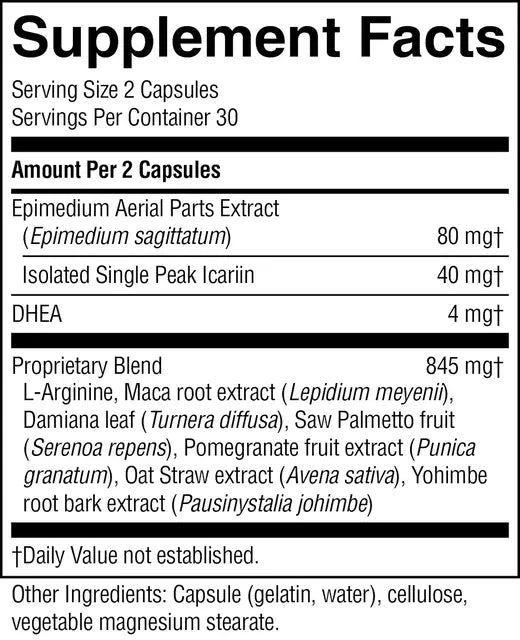 Take 2 capsules before bedtime daily for general libido support. Take 2–6 capsules one hour prior to sexual activity. CAUTION: Consult a doctor if you have a known medical condition, in particular those affecting blood pressure, hormone sensitivity, heart, liver or kidney. Consult a doctor if you are taking any medication, in particular those affecting blood pressure, heart conditions, diabetes, depression or erectile dysfunction. Discontinue use if troubling symptoms occur. Do not exceed recommended dosage. Not for use by persons under the age of 18 and/or pregnant or lactating women. Keep out of the reach of children.